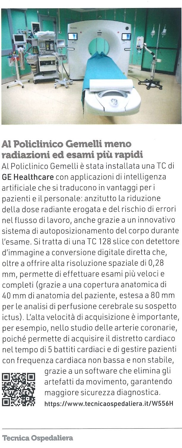 Scarica e leggi l’articolo completo pubblicato da Tecnica Ospedaliera sulla nuova TC installata al Policlinico Gemelli da GE Healthcare
